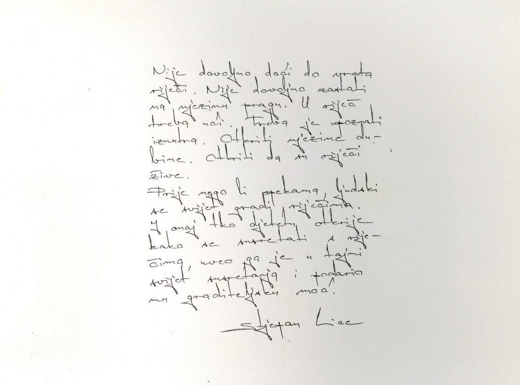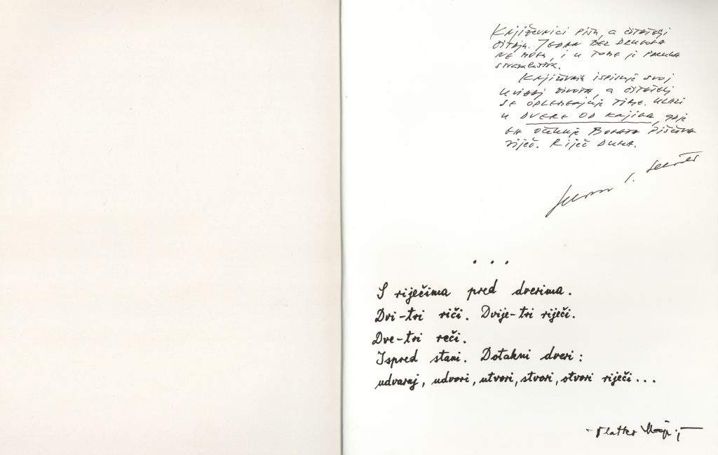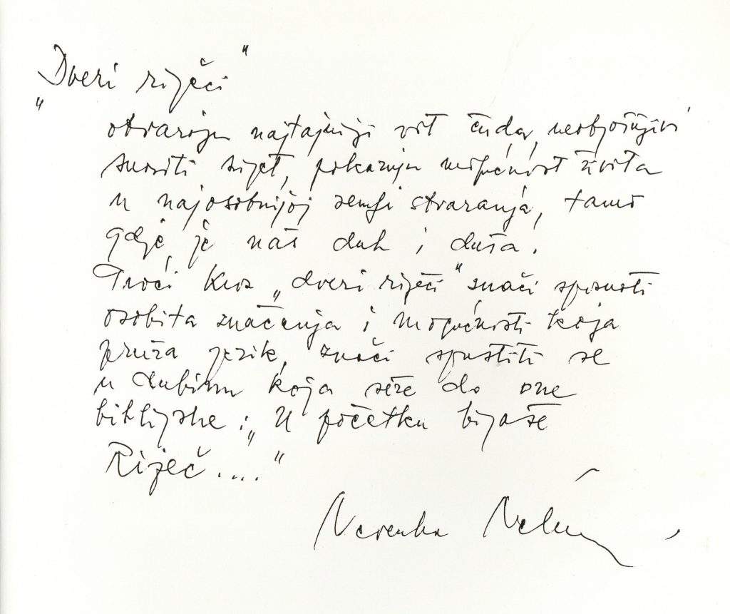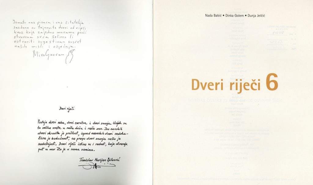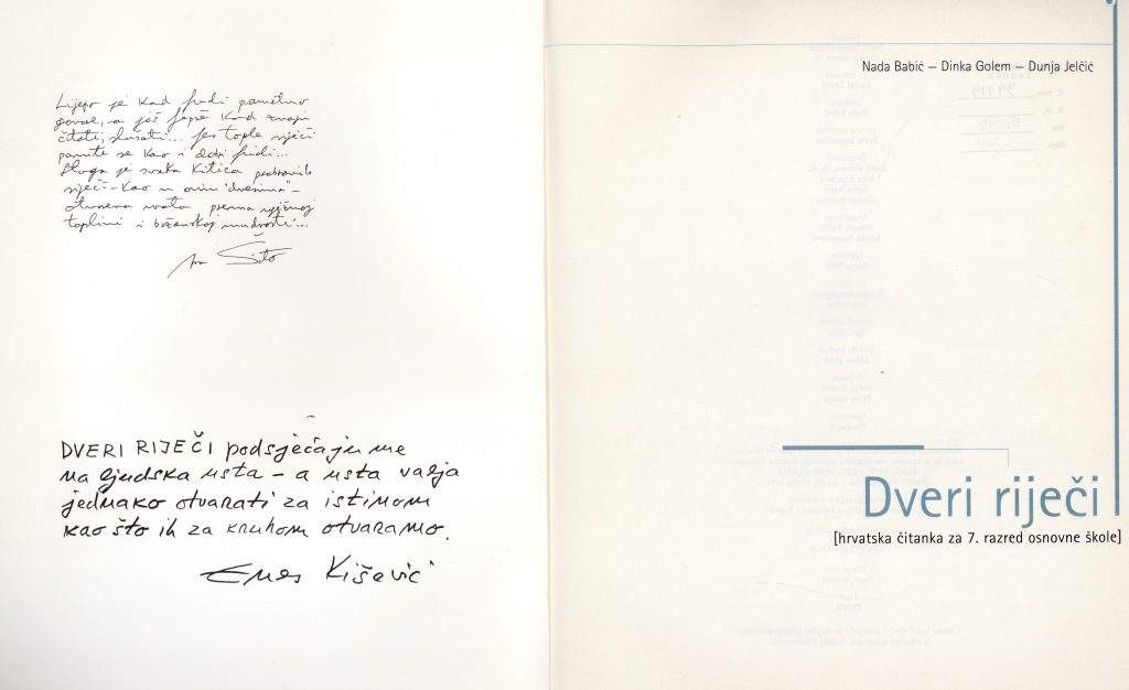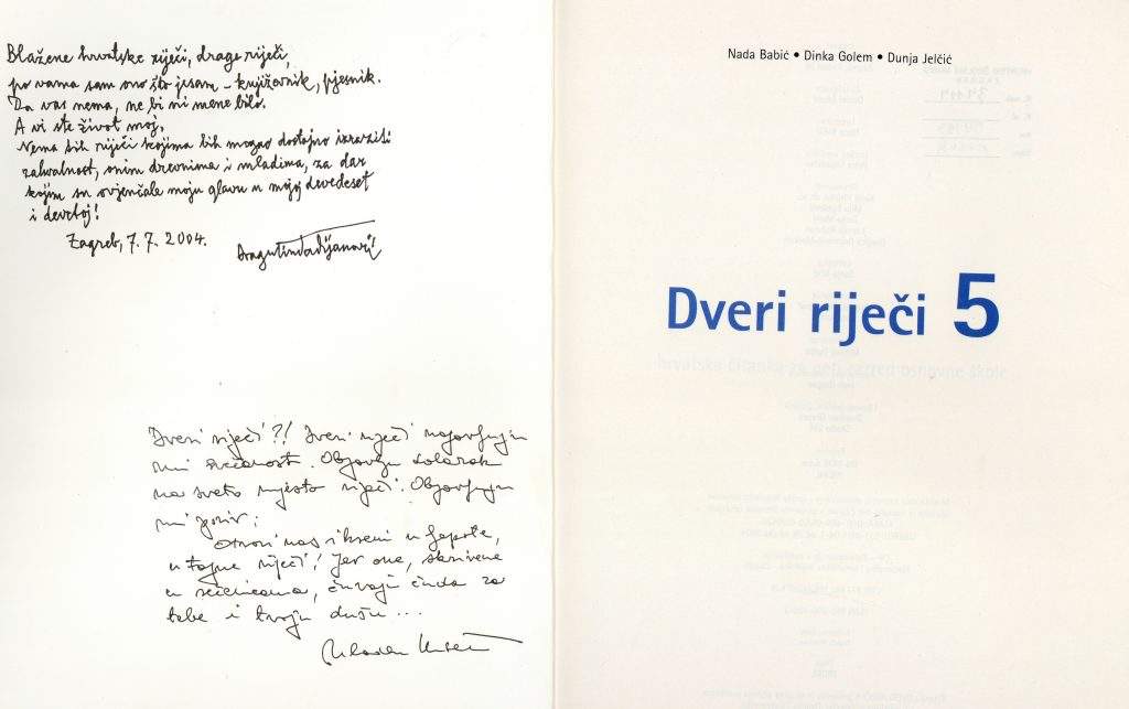 Na prvi pogled sasvim obične čitanke, u dobrom stanju, ne previše rabljene. Do trenutka dok nisam otvorila prvu. Na unutarnjem dijelu prednje korice nešto napisano. Ne čitam odmah nego pomislim kako su autorice pisale posvetu profesoru Beženu. Ipak, nije bilo tako. Autori zapisa su Dragutin Tadijanović i Mladen Kušec, koji tog srpnja 2004. godine zapisuju svaki svoju asocijaciju na riječi „dveri riječi“.