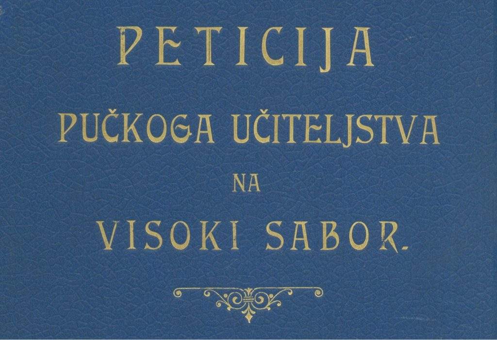 Visoki sabore! Izvanredna opća skupština Saveza hrv. učiteljskih društava, održana koncem rujna o. g. u Zagrebu, na kojoj se sabralo više stotina učitelja i učiteljica sa sviju strana Hrvatske i Slavonije, uzela je u raspravu pitanje o uređenju učiteljskih plaća i pitanje o tom, kako da se udesi nadzor i uprava pučkih škola.